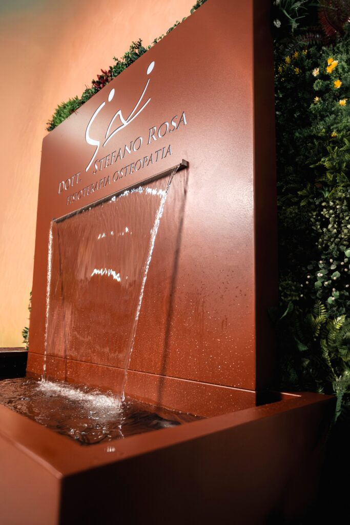 Come tocco finale, il cliente ha voluto personalizzare la cascata con il logo aziendale retroilluminato realizzato tramite taglio laser, inserito frontalmente sulla struttura: un elemento distintivo che ha trasformato il progetto in un pezzo unico ed originale.