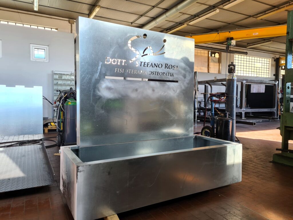 Ricevuto l’ordine, il progetto è passato nelle mani esperte del nostro artigiano. Partendo da pannelli in metallo, ogni pezzo è stato tagliato, sagomato e saldato a mano. Durante l’assemblaggio è stato previsto uno spazio nascosto per l’alloggiamento delle pompe, in modo da garantire un’estetica pulita e ordinata anche una volta installata. Inoltre, è stato inserito un tappo di scarico alla base, fondamentale per le operazioni di svuotamento e manutenzione.