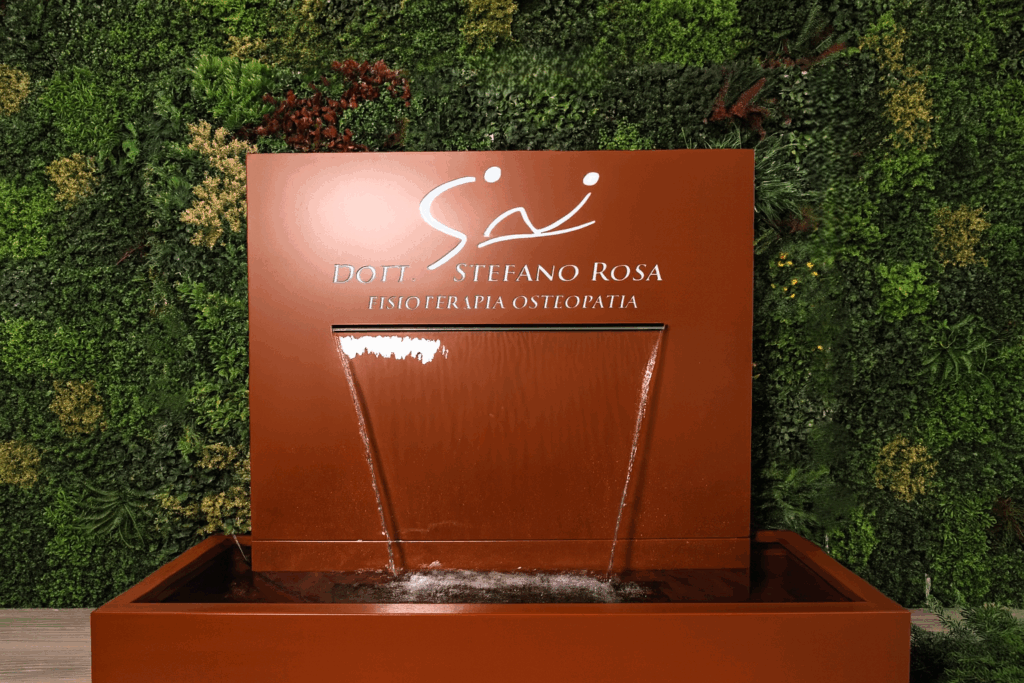 Il Dott. Stefano Rosa ci ha contattati con l’idea di inserire un elemento decorativo d’acqua in un contesto esterno moderno ma con richiami naturali, fuori dal suo studio di fisioterapia. Dopo aver valutato varie opzioni abbiamo puntato al nostro modello Versailles, una struttura pulita, geometrica ed elegante, che si presta benissimo ad ambienti sia interni che esterni. Per renderla ancora più dinamica e scenografica, abbiamo aggiunto una lama in acciaio da 90 cm, studiata per creare un flusso d’acqua capace di catturare l’attenzione con il suo movimento continuo.